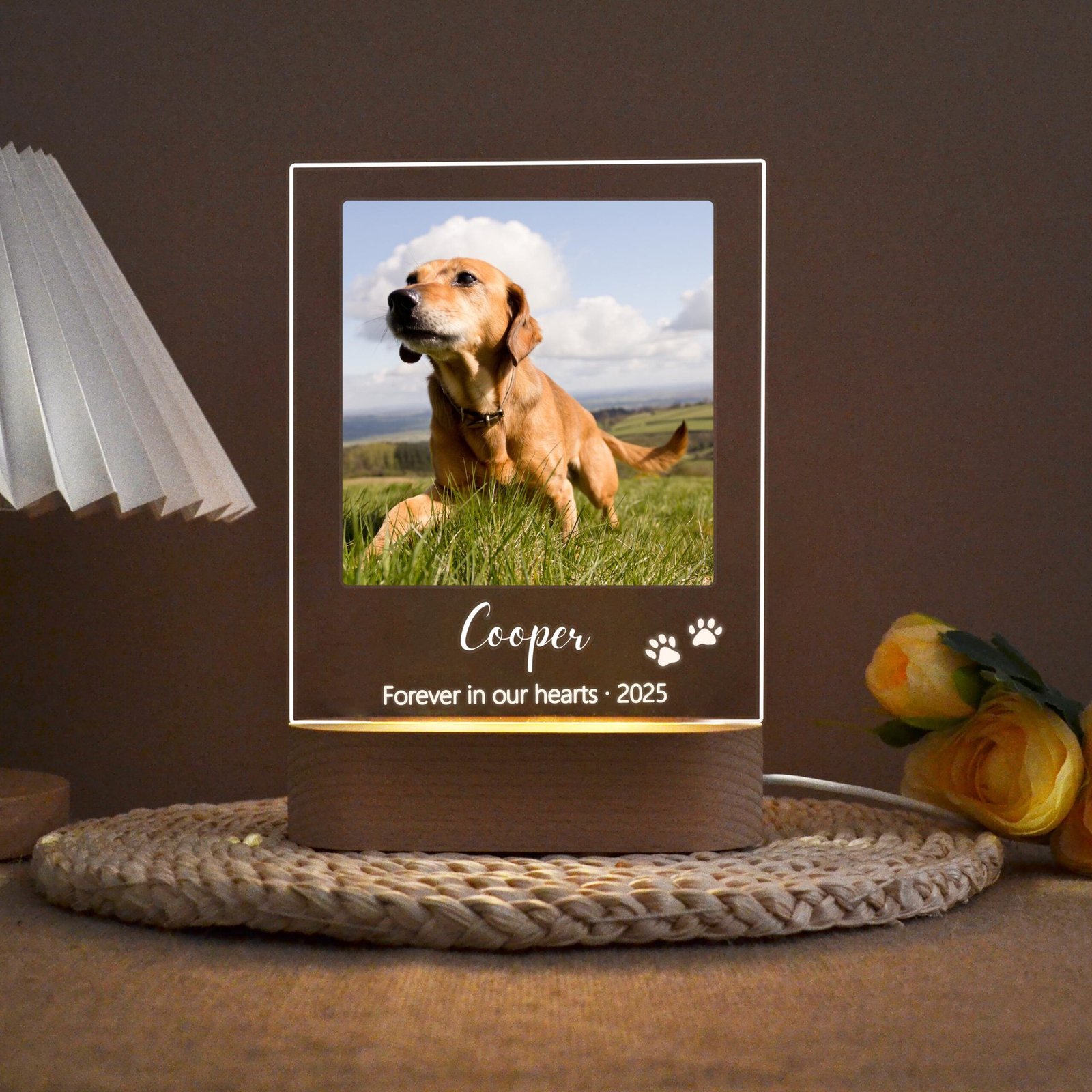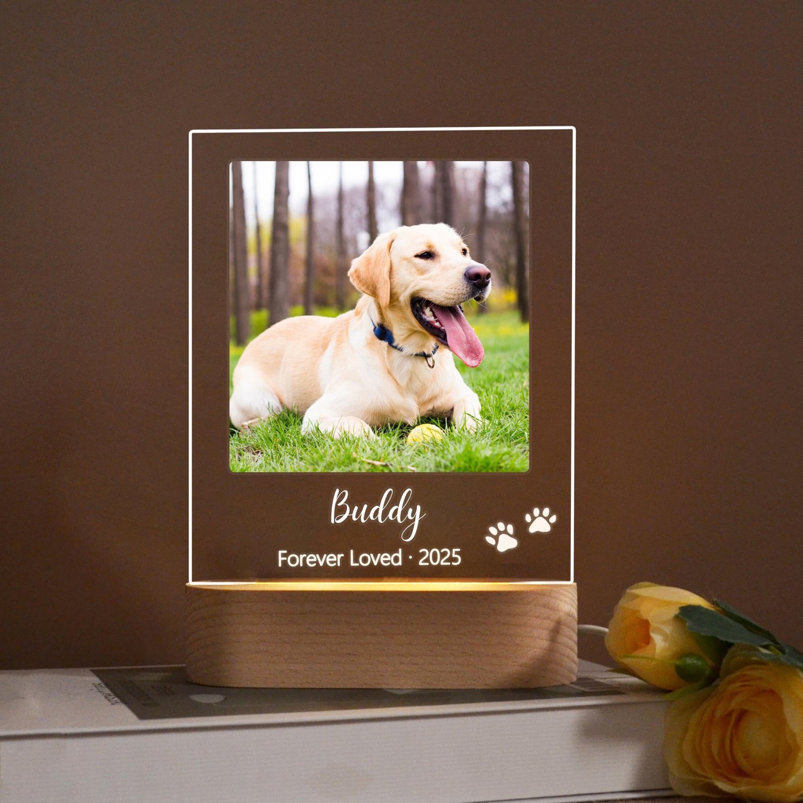 The clean acrylic panel showcases your chosen personalization — your pet’s name, special dates, a heartfelt message, and even their image — all gently lit by a soft LED base that adds warmth to any room.